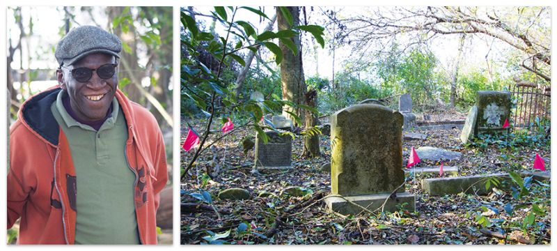 “We’re clearing away overgrowth to create access to the tombstones and beginning some archeological work,” says Ofunniyin, who explains that it’s Gullah custom to leave seashells and treasured possessions on top of graves. “When we find these, we photograph them and mark them but do not remove them,” he explains.