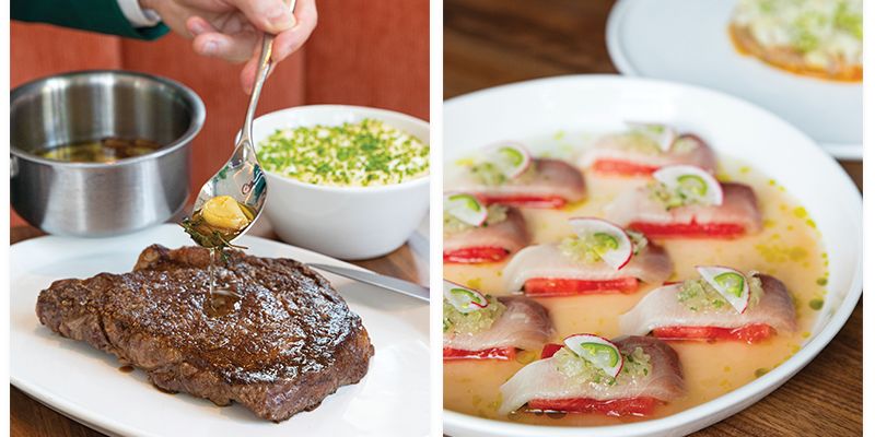 Entrees are harmonious combinations, colored by vibrant hues of plants and the sheen of freshly caught fish. A crudo of vegetables circle ceviche, while seared scallops glisten on a canvas of nutty fregola pasta and smoked onion soubise. Mahogany-grilled lamb chops, braised pork shank osso buco, and umber-grilled beef tenderloin parlay their mineral natures with the umami tastes of mushrooms, potatoes, and wilted bitter greens.
