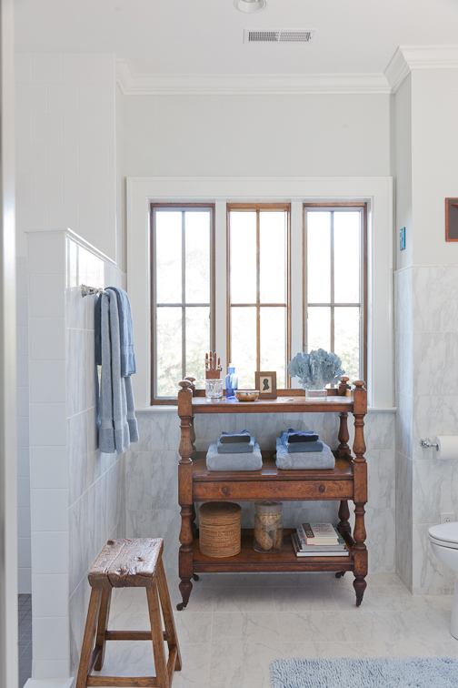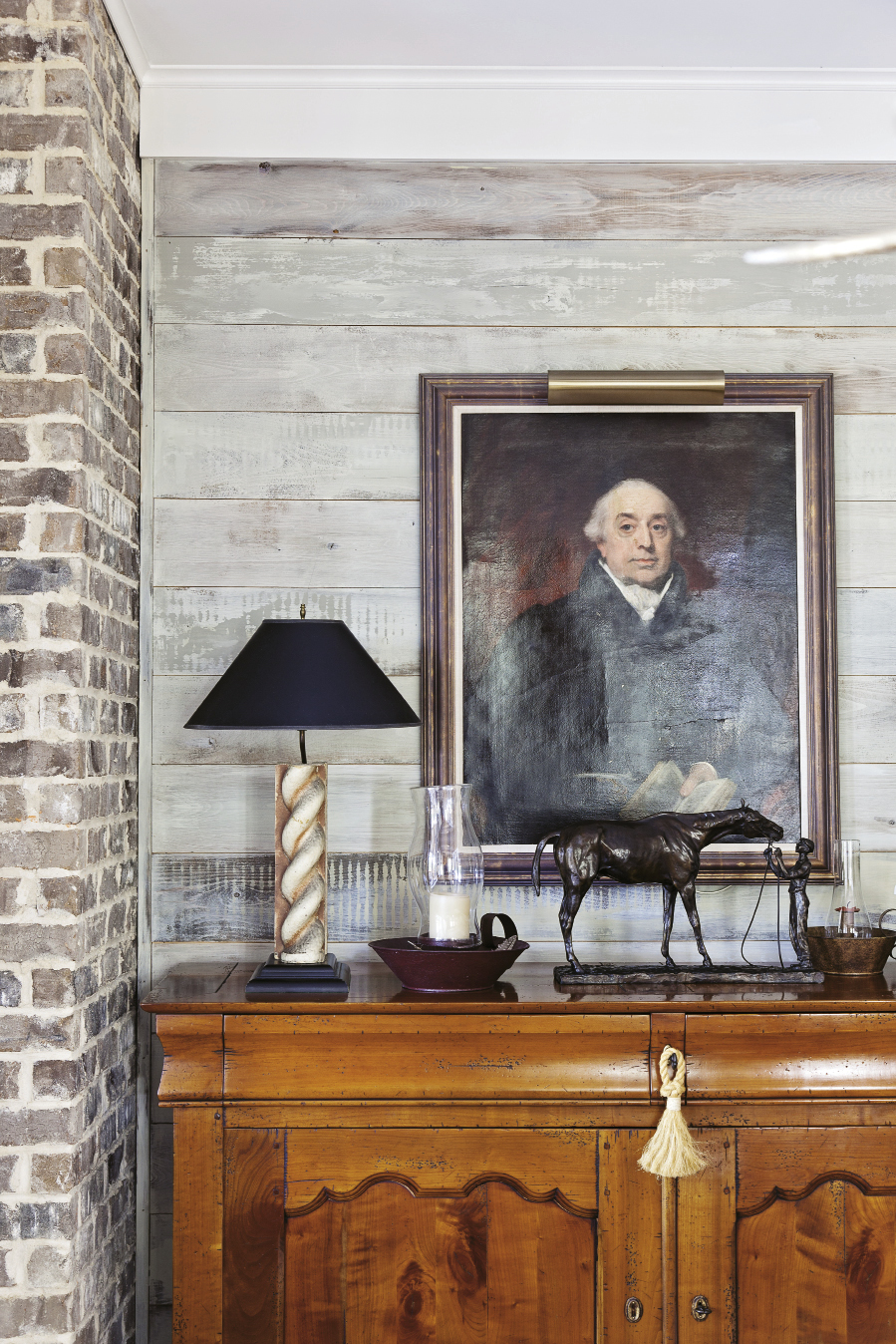 And though construction of the 4,200-square-foot home was completed in 2012, the use of salvaged materials—and new materials cleverly altered to look reclaimed—conveys a mood that’s more soulful and antique. Roughed-up telephone poles were rescued from a coal pile in Walterboro and reimagined as interior columns in the living room. Steel wall sconces that grace the same room were discovered in a second-hand shop and given a few treatments of acid to enhance their patina. And a hunk of heart pine found roadside on the Charleston Neck became a fireplace mantel in the bedroom. “I’m a collector, and it’s all about the hunt for me,” Hollingsworth says, adding that she filled six storage units with salvaged finds during the five years it took to design and build the home.