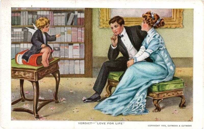 The Gutmann and Gutmann Company, which specialized in fine art prints, hired Grimball for her images of courting couples—profiles of lovers creating the image of a loving cup as they kiss, a wise cupid pronouncing his verdict of “love for life,” and the like—using them to adorn postcards that winged their way through the mail and into the hearts of many. Even more popular were her works of the results of romance: illustrated blank books for brides to record their ceremonies and baby books for mothers to note their children’s first steps, first words, and other milestones.