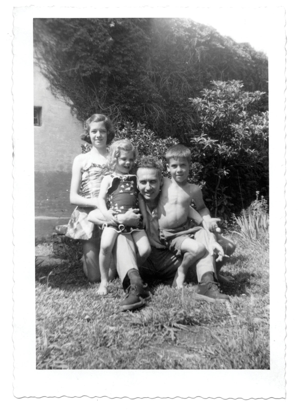 (Left) Ringside #4 (acrylic on canvas, 30 X 40 inches) by Corrie McCallum; (right) The family, circa 1956: Paige, Corrie, Louise (on the floor), David, and William; McCallum was quoted as saying: “I’ve always felt that if you are a woman, it’s important, if possible, to experience all aspects of what that means, particularly our unique bond with children.”