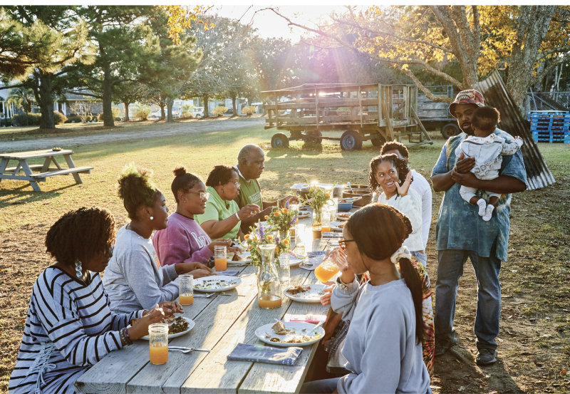 Gather Round: Dennis’s family and friends, including hosts Helen and Joseph Fields (in green), dig into the feast.