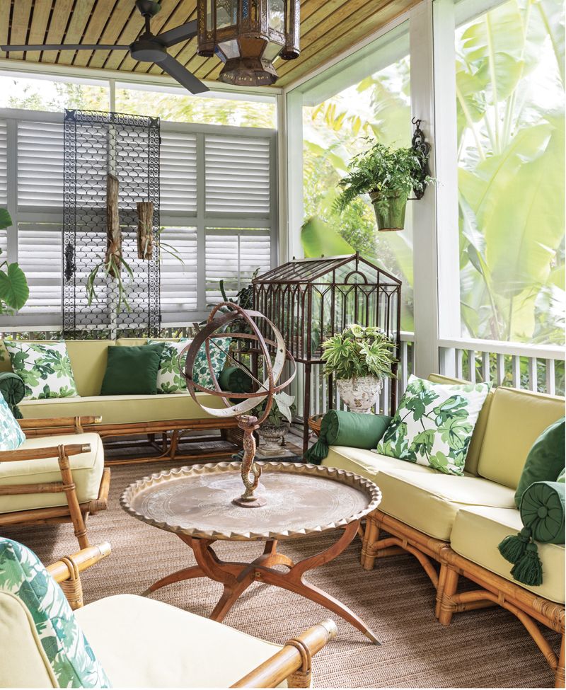 Alexandra took inspiration from the lush tropical garden when honing the family room’s crisp green-and-white color palette. (Opposite) Shaded by banana trees, the screened porch is designed to feel like an adult tree house.