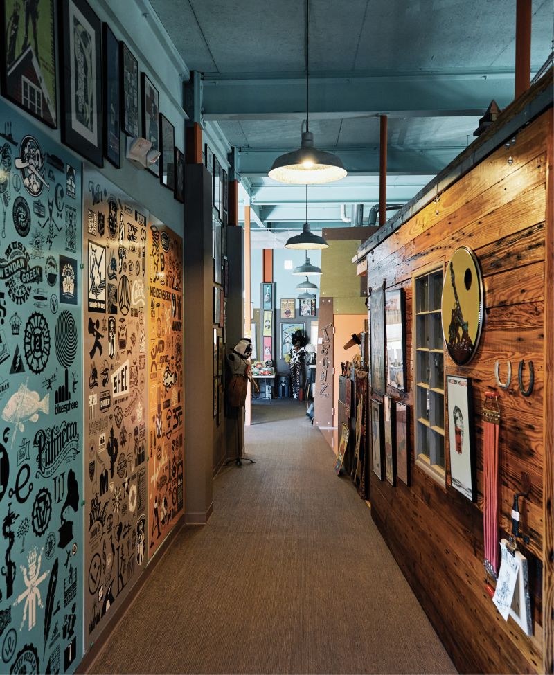 Products emblazoned with Shuler’s designs— from beer cans and wine bottles to books, brochures, posters, and more—fill the shelves in the conference room.