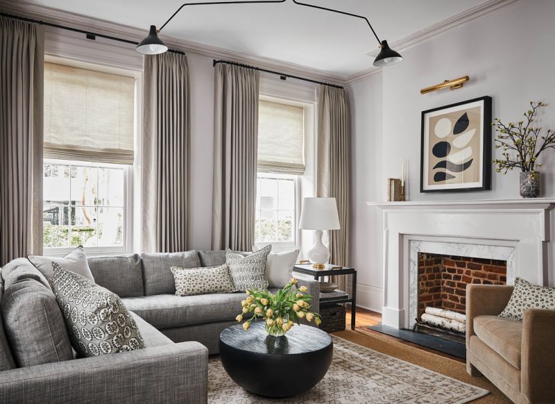 Yin & Yang: The light-filled living room features warm touches, from a neutral rug and pale gray drapes to a coffee-colored mohair chair from McGee & Co. The theme is balanced by a custom sofa covered in a gray performance fabric from Perennials and black accent pieces. The round “Maureen” coffee table, also from McGee & Co., allows for easier flow in the compact space.
