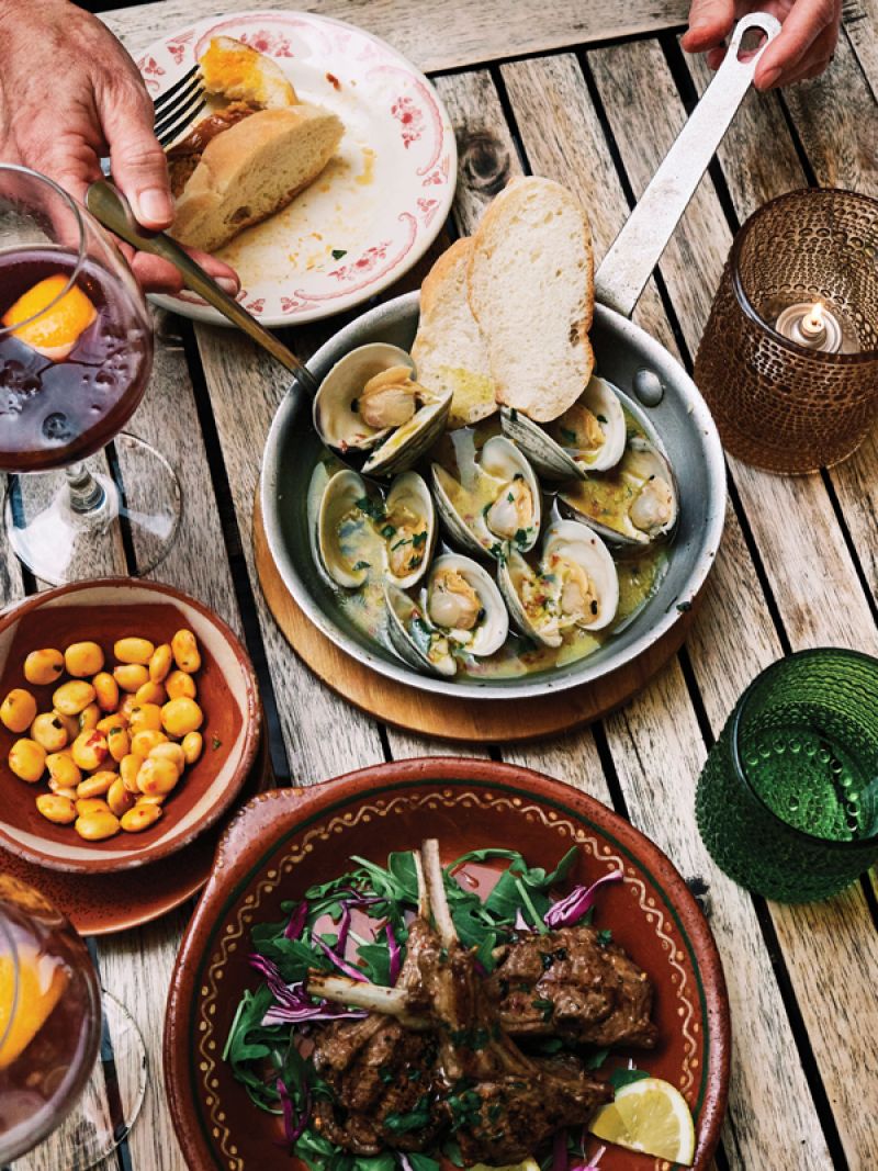Pitchers of sangria, clams in a garlic-herb broth, marinated lamb chops, and lupini beans at Aguardente, a new addition to a Providence neighborhood that’s been home to Portuguese immigrants for centuries.