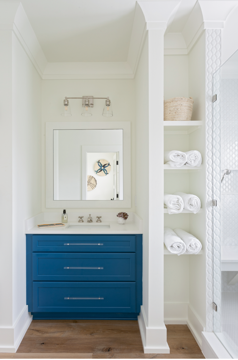 A Pop of Color: The daughters share this remodeled bathroom, which was redesigned to afford a much larger shower space, complete with a bench and finished in subway tile from Melcer Tile. Custom cabinetry from Spartina Cabinets is offset by the Benjamin Moore “Simply White” wall color and illuminated by a vanity light in polished nickel from Carolina Lanterns.