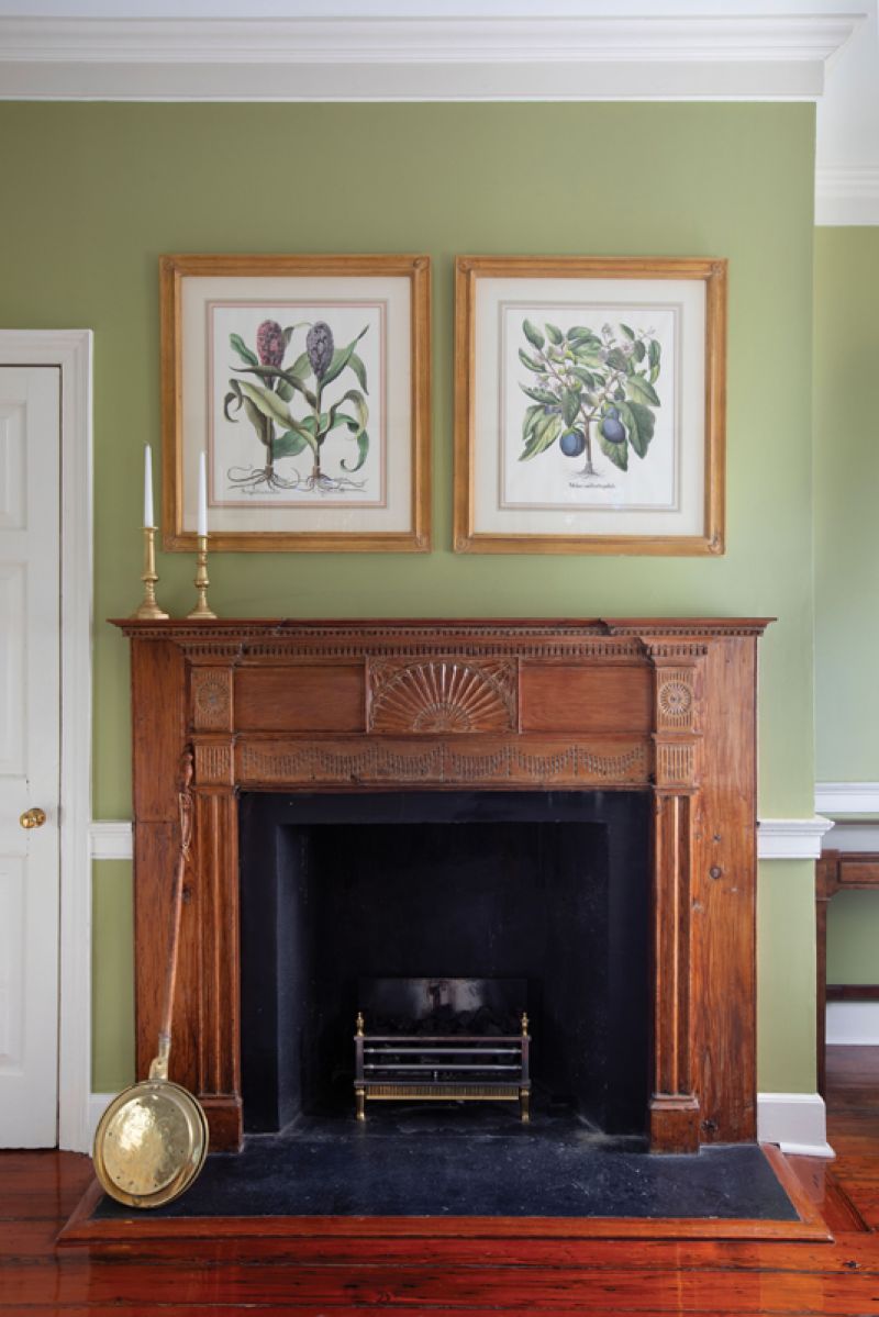 Here, another original hand-carved mantelpiece takes center stage, complemented by Benjamin Moore “Brookside Moss” paint.
