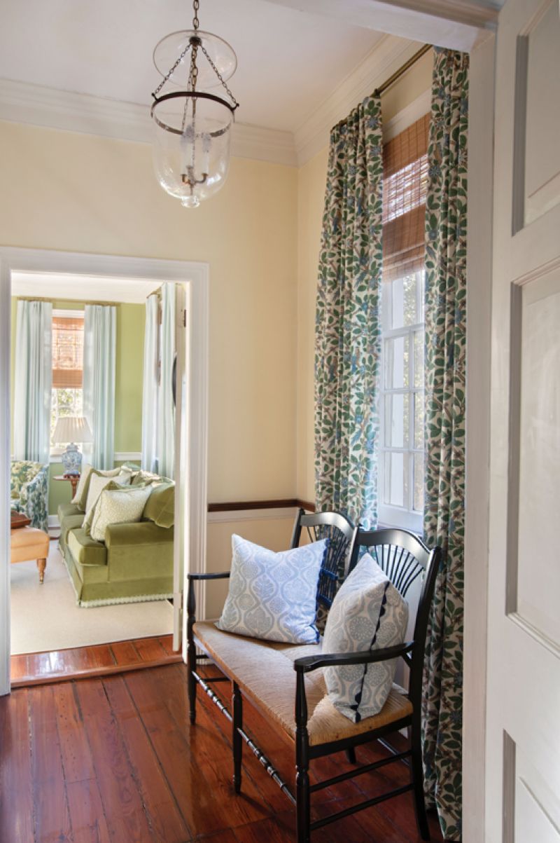 Caitlin added interest in the entry hall with a blue rug and stair runner from Designer Carpets on John’s Island and floral drapes. Benjamin Moore’s soft “Windham Cream” paint highlights the original wood floor and antique console table.
