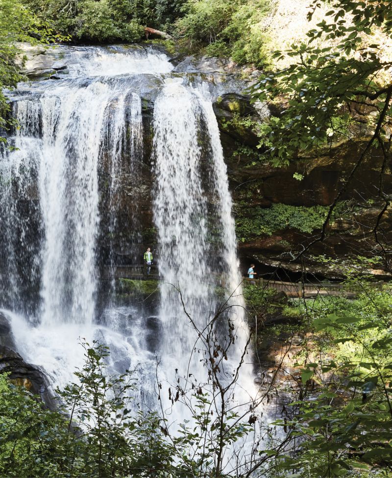 Cool Mist: Visitors follow the trail behind the cascading water at Dry Falls in Highlands, North Carolina. (Opposie) Courtyard doors to guest rooms at the newly renovated Skyline Lodge, a few miles from the small town center.