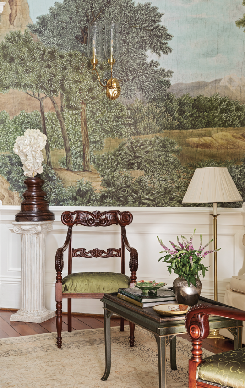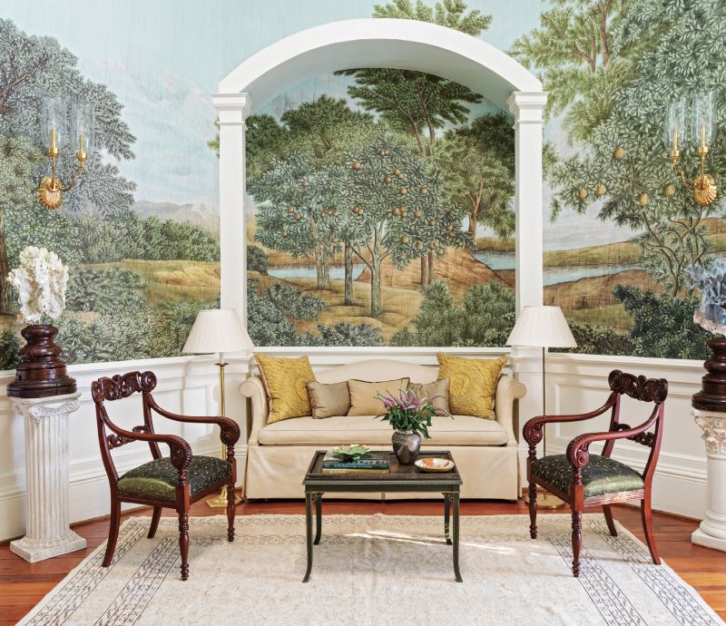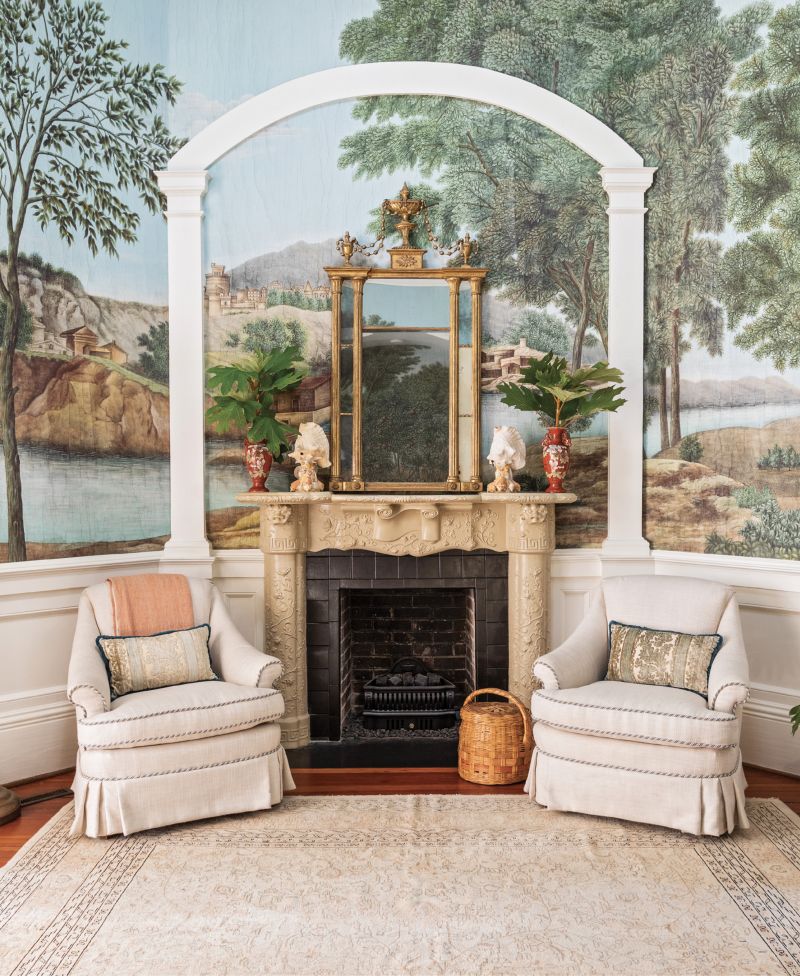 Designer Alaina Michelle Ralph transformed this nearly 150-year-old Summerville home with a careful selection of period-appropriate antiques and a showstopping Iksel wallpaper depicting the Italian countryside to complement the Italianate architecture.