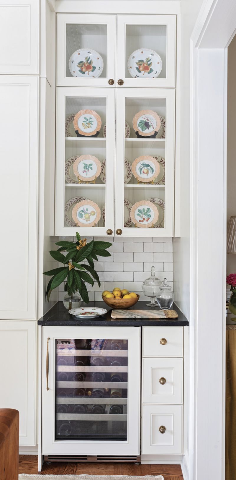 Fine Dining: The rotunda opens into the dining room, a later addition, which itself leads to the renovated kitchen. Ralph opened up these rooms to create one continuous space. She kept the original basket-weave parquet floors, continuing them into the kitchen to tie the rooms together. She also updated the window trim work to better match the original architectural details and added an ornate chandelier from David Skinner Antiques above the dining table. The antique sideboard holds two urn lamps from Wynsum Antiques & Interiors; a Grecian figure below a convex mirror from Well Furnished adds a touch of whimsy to the scene.