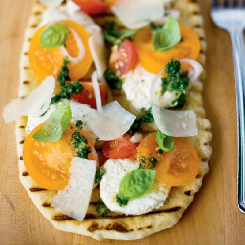 To finish the piadina, heat a grill to medium-high.Shave the Parmesan with a vegetable peeler and set aside. Chop the burrata.