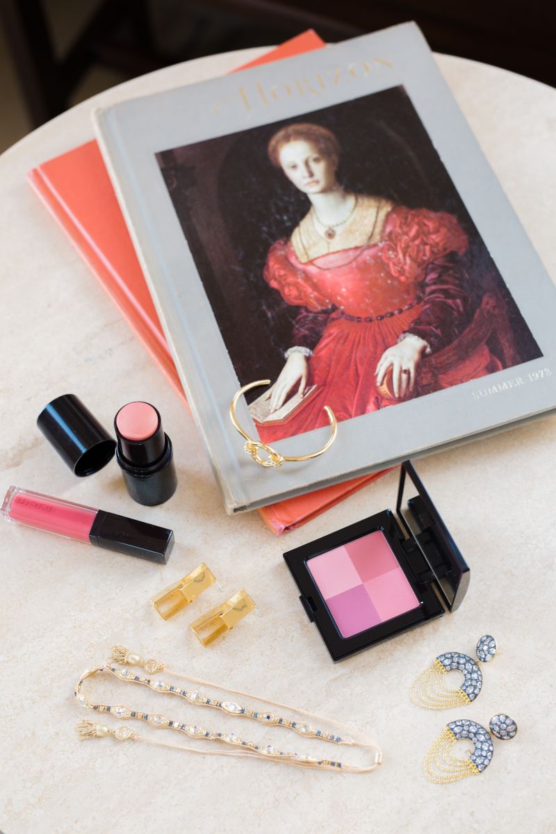 All That Glitters: (Clockwise from top right) Julie Vos 24K gold-plate bangles, $75 each, and 24K gold-plate “Monterey“ necklace in “aquamarine blue,” $395, both at Abide A While Garden Boutique; Kenneth Jay Lane cabachon earrings, $125 at Croghan’s Jewel Box; “Chunky ’80s Headlight Pearl Drop” earrings, $68 at Candy Shop Vintage; Freida Rothman gold-plate “Matilda“ necklace, $250, and Freida Rothman gold-vermeil “Amazonian“ square pavé necklace, $385, both at Croghan’s Jewel Box